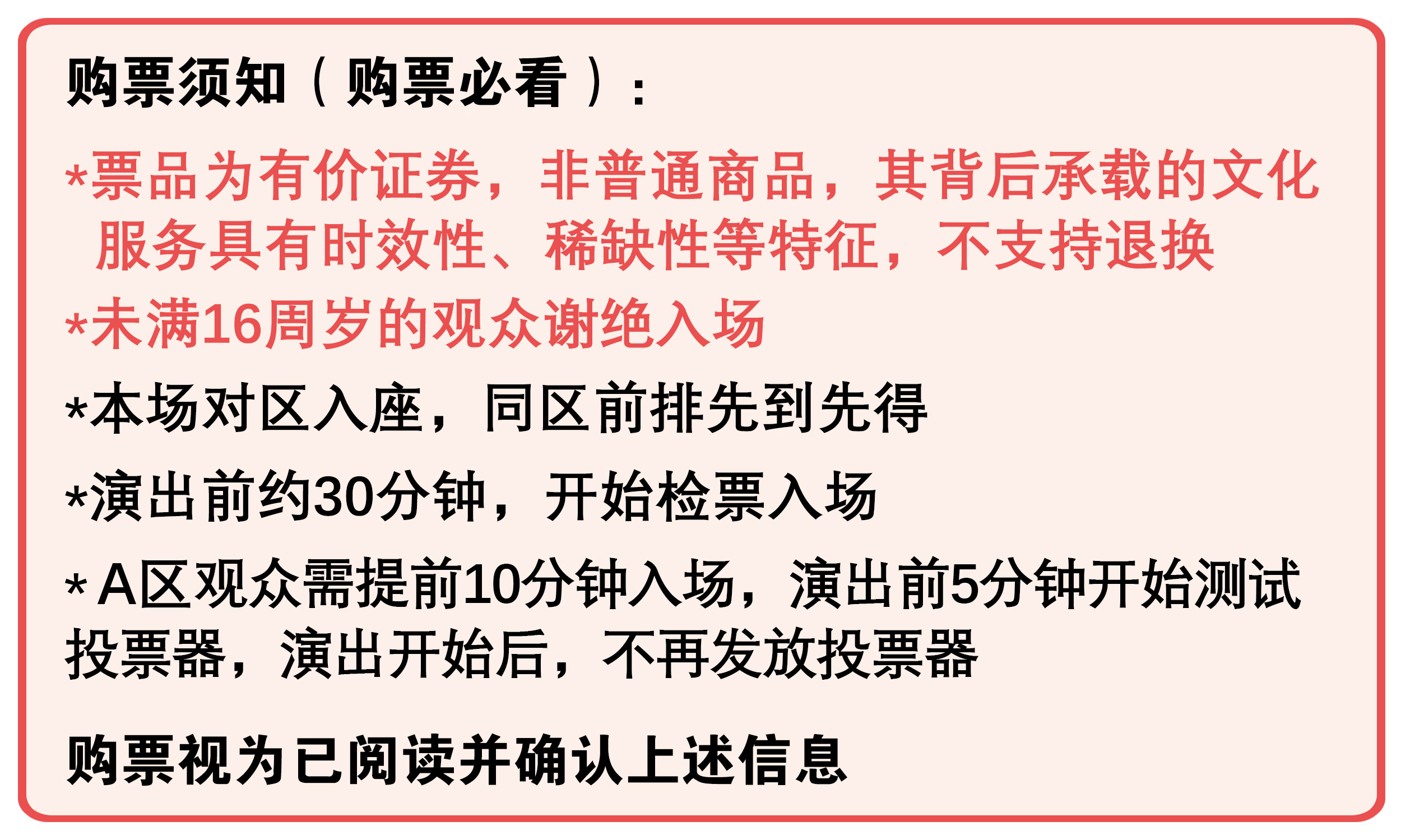 1.购买前请您提前规划好行程,做好相应准备,以免影响您的正常观演,感谢您的理解和配合。