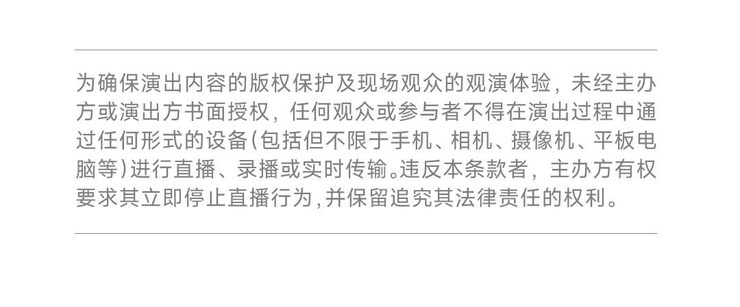 1.购买前请您提前规划好行程,做好相应准备,以免影响您的正常观演,感谢您的理解和配合。